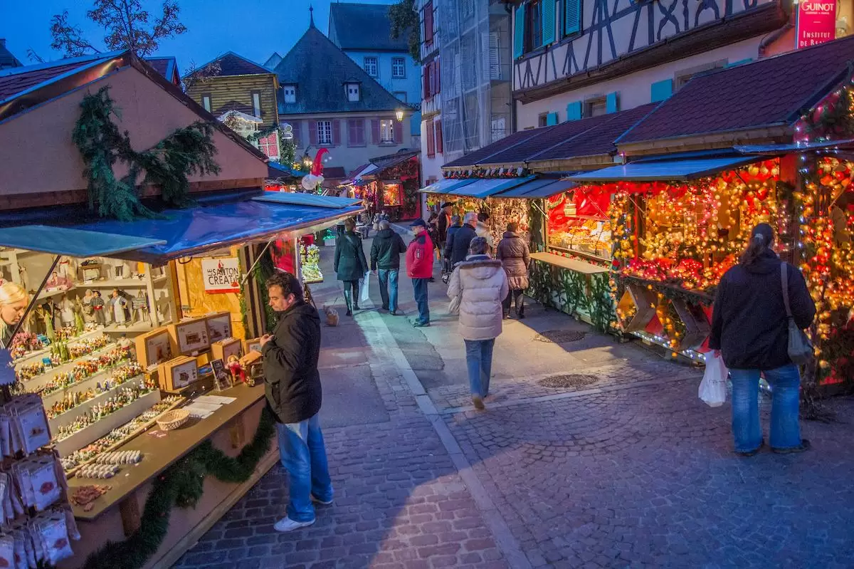 Colmar, located in the Alsace region of France, transforms into a fairytale town during the Christmas season, with its charming setting enhanced by timbered houses and a canal system. The markets are spread around the city’s old town center and feature local delicacies, handcrafted goods like ornaments, jewelry, pottery, and holiday sweets and toys. The intimate scale of this market and the stunning architecture make Colmar’s Christmas markets an unforgettable experience. Open from November 26th to December 24th, 2025.